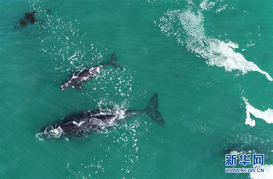 9月30日,在南非赫曼紐斯小鎮(zhèn)附近海面上,2頭南露脊鯨在海岸邊暢游。9月29日,位于開普敦以東約115公里的赫曼紐斯小鎮(zhèn)迎來2018年的鯨魚節(jié),來自世界各地的游客可乘船出海觀鯨,也可在岸邊等待鯨魚的到來。新華社記者陳誠攝