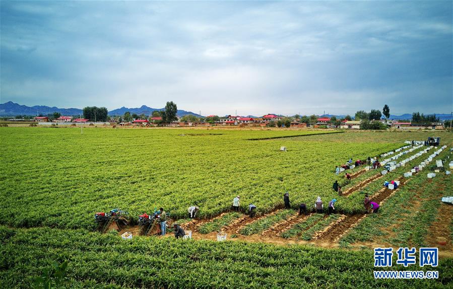 10月9日,秦皇島市撫寧區(qū)留守營(yíng)鎮(zhèn)桑園村農(nóng)民在收獲生姜(無(wú)人機(jī)拍攝)。 近年來(lái),河北省秦皇島市撫寧區(qū)在農(nóng)業(yè)結(jié)構(gòu)調(diào)整過(guò)程中,引導(dǎo)當(dāng)?shù)剞r(nóng)民種植優(yōu)質(zhì)無(wú)公害生姜,并安排農(nóng)業(yè)技術(shù)員定期到田間指導(dǎo)農(nóng)民對(duì)生姜進(jìn)行標(biāo)準(zhǔn)化管理。據(jù)介紹,今年該縣生姜種植面積1萬(wàn)多畝,預(yù)計(jì)產(chǎn)生姜5萬(wàn)噸,種植戶(hù)每畝純收入達(dá)1萬(wàn)多元。 新華社記者 楊世堯 攝