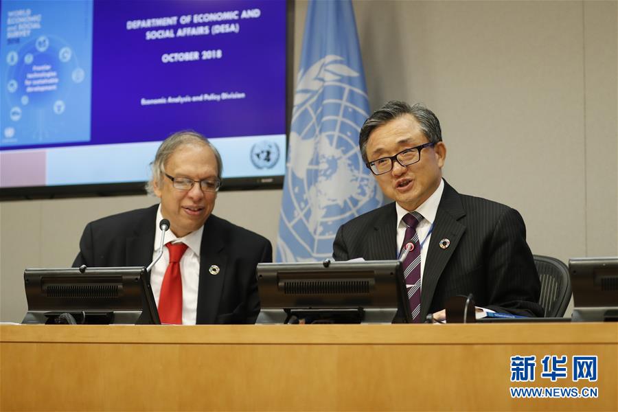 10月8日,在位于紐約的聯(lián)合國(guó)總部,聯(lián)合國(guó)負(fù)責(zé)經(jīng)濟(jì)和社會(huì)事務(wù)的副秘書長(zhǎng)劉振民(右)向記者介紹《2018年世界經(jīng)濟(jì)和社會(huì)概覽》。 新華社記者李木子攝