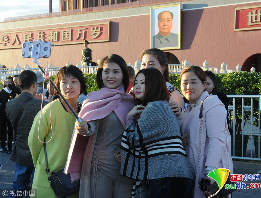 游客著秋冬裝天安門廣場(chǎng)合影。