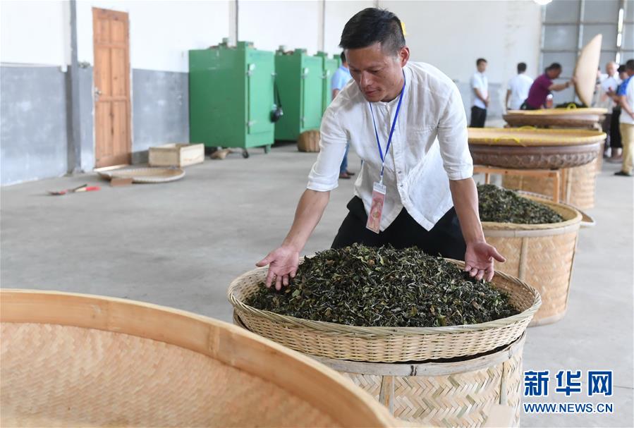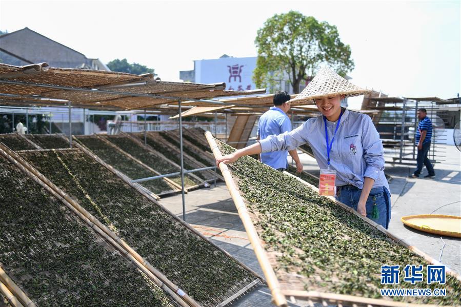 10月9日,參賽選手將茶葉上架曬制。