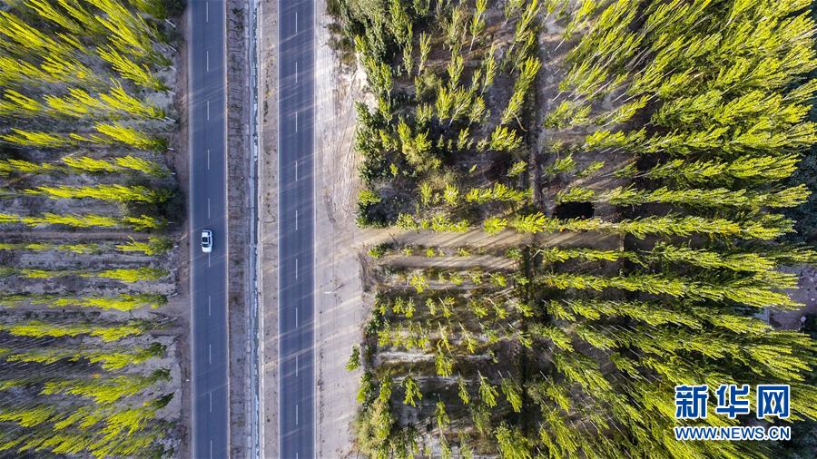 車輛行駛在新疆阿克蘇地區(qū)柯柯牙綠化工程核心區(qū)(9月20日無(wú)人機(jī)拍攝)。 在世界第二大流動(dòng)性沙漠——塔克拉瑪干沙漠西北邊,一條逾百萬(wàn)畝的人工林帶傲然挺立。 這條林帶就是柯柯牙荒漠綠化工程。它是新疆阿克蘇黃沙漫漫和碧波萬(wàn)頃的分界嶺。 1986年,為改變惡劣的自然條件,阿克蘇啟動(dòng)柯柯牙綠化工程。30年間,各族干部群眾攜手奮斗,曾是沙塵暴策源地的柯柯牙綠樹成蔭;并以此為原點(diǎn),在南疆戈壁荒灘上孕育出百萬(wàn)畝的“綠?!?。 30多年來(lái),阿克蘇打造出“人走政不息”的樣本,使綠色發(fā)展理念成為幾代人的廣泛共識(shí);“自力更生、艱苦奮斗、無(wú)私奉獻(xiàn)”的柯柯牙精神,已融入各族兒女血液中;“以林養(yǎng)林”“邊綠化邊脫貧”的綠化、脫貧方式,給其他荒漠地區(qū)貢獻(xiàn)了“柯柯牙智慧”。 新華社記者 胡虎虎 攝