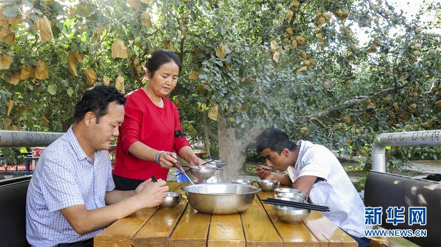 甘永軍(左一)在地處新疆阿克蘇地區(qū)柯柯牙綠化工程內(nèi)的果園吃飯(2017年9月22日攝)。10年前,甘永軍還在果園開起了第一個農(nóng)家樂,帶動周邊100多戶果農(nóng)經(jīng)營起了自家庭院。 在世界第二大流動性沙漠——塔克拉瑪干沙漠西北邊,一條逾百萬畝的人工林帶傲然挺立。 這條林帶就是柯柯牙荒漠綠化工程。它是新疆阿克蘇黃沙漫漫和碧波萬頃的分界嶺。 1986年,為改變惡劣的自然條件,阿克蘇啟動柯柯牙綠化工程。30年間,各族干部群眾攜手奮斗,曾是沙塵暴策源地的柯柯牙綠樹成蔭;并以此為原點,在南疆戈壁荒灘上孕育出百萬畝的“綠?!?。 30多年來,阿克蘇打造出“人走政不息”的樣本,使綠色發(fā)展理念成為幾代人的廣泛共識;“自力更生、艱苦奮斗、無私奉獻(xiàn)”的柯柯牙精神,已融入各族兒女血液中;“以林養(yǎng)林”“邊綠化邊脫貧”的綠化、脫貧方式,給其他荒漠地區(qū)貢獻(xiàn)了“柯柯牙智慧”。 新華社記者 杜剛 攝
