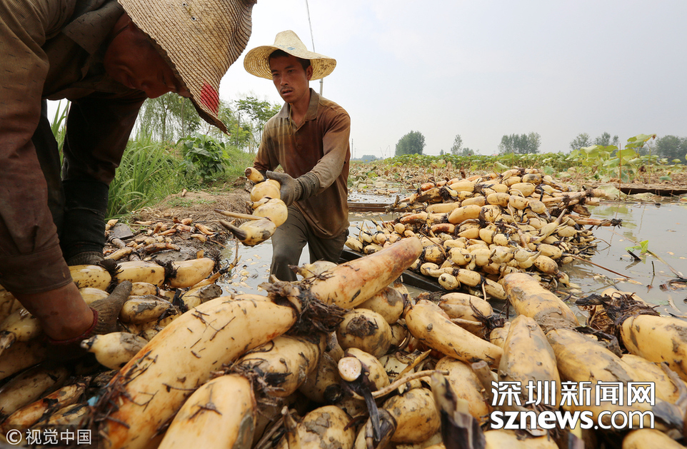 2018年7月25日,江蘇淮安,種植戶在挖藕帶。 相關(guān)鏈接 夏日種藕正當(dāng)時 |