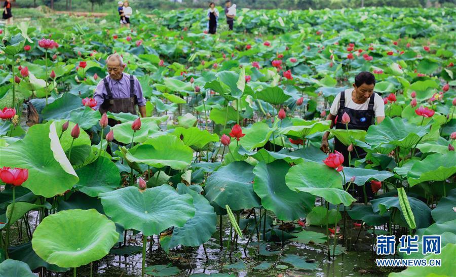 6月3日,荷農(nóng)們?cè)诤苫ɑ乩锾暨x準(zhǔn)備出售的觀賞性荷花。新華社記者 徐昱 攝