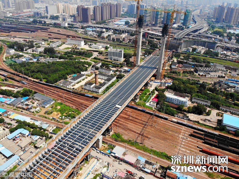 在橋梁頂推的同時,設(shè)計(jì)高度為150米的主塔也在不斷“長高”,目前高度為130米?!爸魉跇蛄耗媳眱蓚?cè)各有一個,均為每次(8~10天)升高6米?!遍Z斌說,主塔預(yù)計(jì)在9月中旬澆筑到位,10月份將安裝斜拉索。