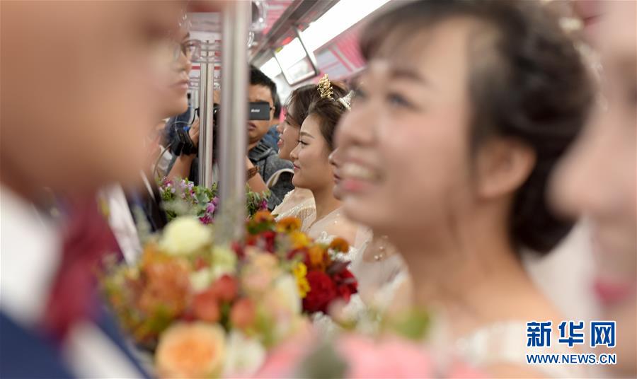 10月18日,在合肥市地鐵一號(hào)線,新人們準(zhǔn)備乘坐地鐵。當(dāng)日,中鐵四局集團(tuán)城市軌道交通工程分公司的18對(duì)新人在安徽合肥地鐵一號(hào)線的車廂里舉行了一場(chǎng)集體婚禮儀式。 新華社記者 郭晨 攝