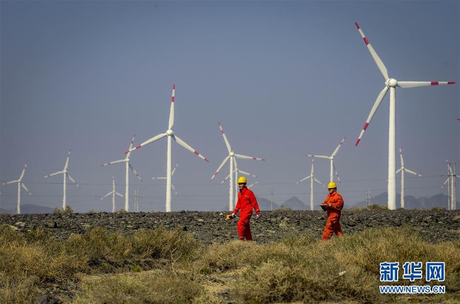 在新疆烏魯木齊達坂城風力發(fā)電場,工作人員馬木爾別克(左)和尤志強查看風力發(fā)電設備(2018年9月18日攝)。今年以來,新疆穩(wěn)步推進新能源參與“疆電外送”、擴大與燃煤自備電廠調(diào)峰替代交易等多種電力交易方式,著力破解“綠色電力”上網(wǎng)難題,新能源發(fā)電量同比增加近13個百分點,而棄電量和棄電比實現(xiàn)“雙降”,綠色發(fā)展理念進一步落實。 新疆是我國重要的能源供應和儲備基地,風能、太陽能儲量豐富。近年來,新疆新能源裝機總量突破2700萬千瓦,規(guī)模和占比均居全國前列。新華社記者 趙戈 攝