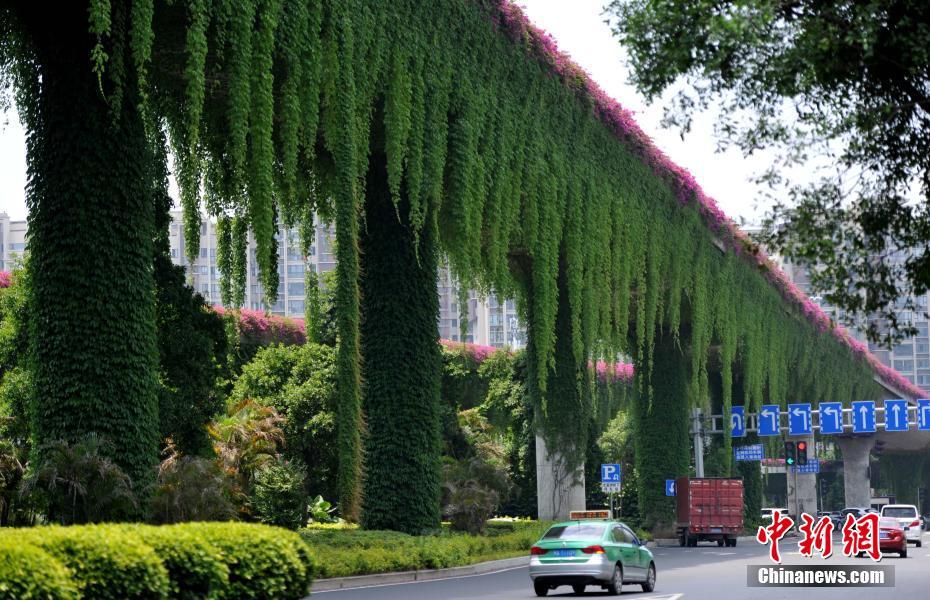 5月13日,福州市區(qū)一立交橋長(zhǎng)滿了枝葉繁茂的爬山虎,遠(yuǎn)遠(yuǎn)望去,好像穿上了一件“綠衣”,成為福州街頭一景。中新社記者 張斌攝