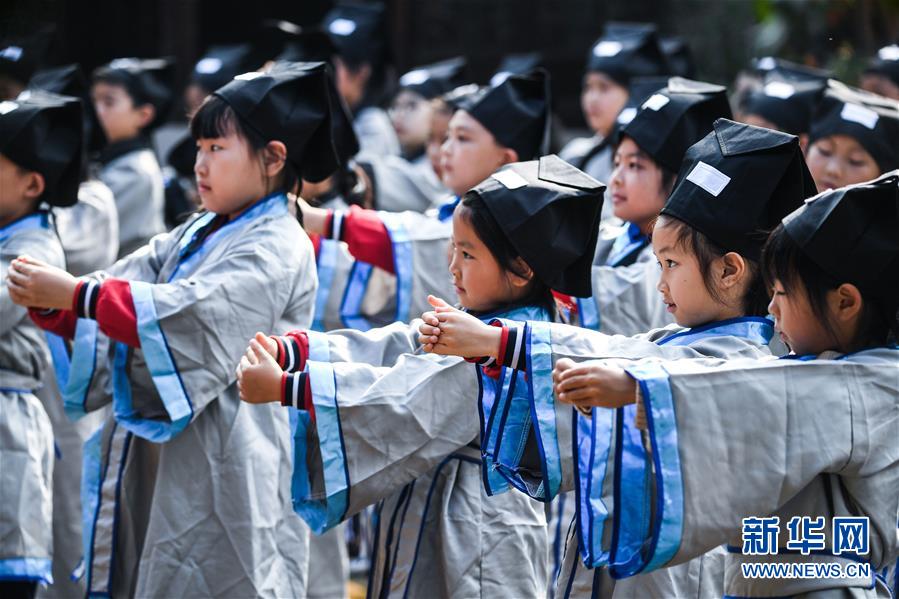 10月23日,學生們在老師的帶領下學習敬拜禮儀。當日,浙江省長興縣第八小學舉行“誦家規(guī)家訓,傳中華美德”校園“誠敬日”主題教育活動,通過誦讀國學經典、講勵志故事、演美德戲劇等形式,讓學生感受優(yōu)秀傳統(tǒng)文化。近年來,該學校立足“誠敬”文化,注重國學啟蒙教育,讓學生從小培養(yǎng)“以誠立身、以敬處事”的良好品質。新華社記者 徐昱 攝