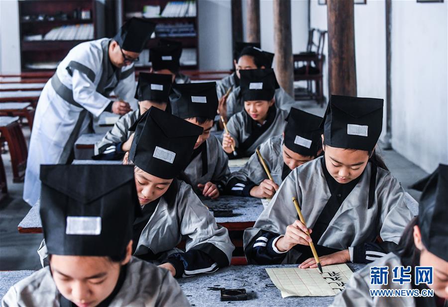 10月23日,學生們在參加“誠敬日”傳統(tǒng)書法學習。當日,浙江省長興縣第八小學舉行“誦家規(guī)家訓,傳中華美德”校園“誠敬日”主題教育活動,通過誦讀國學經典、講勵志故事、演美德戲劇等形式,讓學生感受優(yōu)秀傳統(tǒng)文化。近年來,該學校立足“誠敬”文化,注重國學啟蒙教育,讓學生從小培養(yǎng)“以誠立身、以敬處事”的良好品質。新華社記者 徐昱 攝