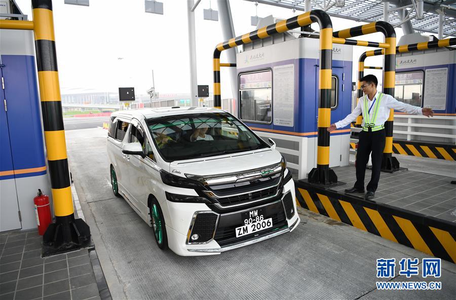 10月24日,首輛私家車(chē)在澳門(mén)口岸離境車(chē)道上通關(guān)。當(dāng)日9時(shí),港珠澳大橋正式通車(chē)。 新華社記者張金加攝