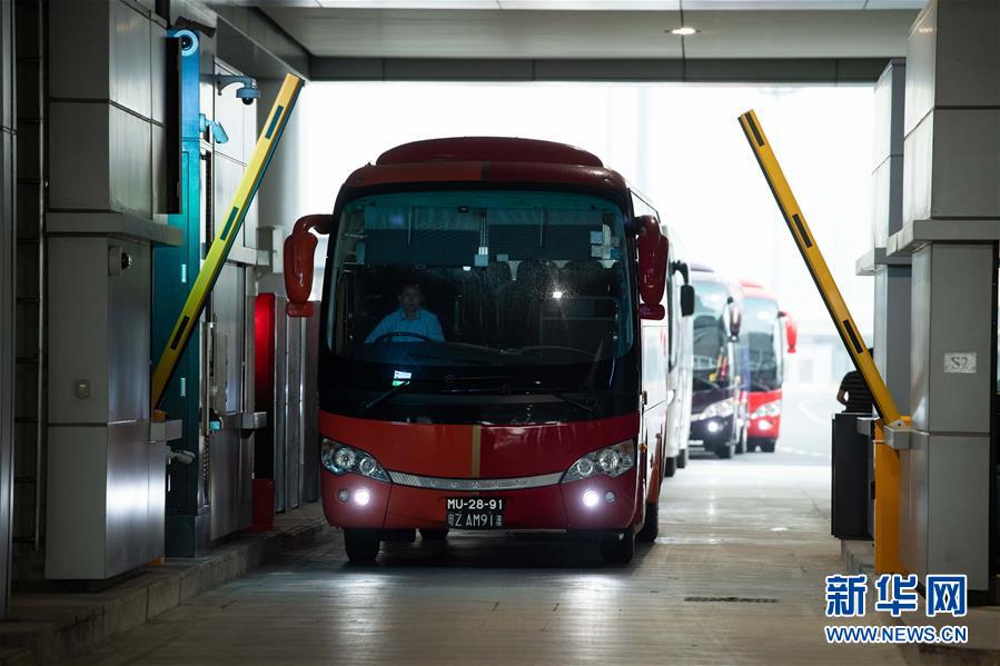 10月24日,跨境巴士在澳門(mén)口岸離境車(chē)道上通關(guān)。當(dāng)日9時(shí),港珠澳大橋正式通車(chē)。 新華社記者張金加攝