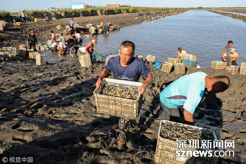 深圳新聞網(wǎng)訊 2018年9月8日,遼寧丹東,早上5點(diǎn),挖蟶人紛紛下到各個池子,要在海水海泥里艱辛勞作10小時,直至下午3點(diǎn)集體上岸,等待買家的運(yùn)輸車隊運(yùn)走他們的勞動成果。9月初,遼寧沿海養(yǎng)殖區(qū)進(jìn)入養(yǎng)殖海鮮的收獲季。在東港,常常出現(xiàn)數(shù)百人乃至上千人集結(jié)在池子里挖蟶子(這里特指縊蟶,即東港當(dāng)?shù)厝怂f的小人仙。下同)的壯觀景象。在養(yǎng)殖海鮮的收獲季,成群的海鷗趁機(jī)“助陣“,人與大自然和諧共處的畫面令人嘆為觀止。