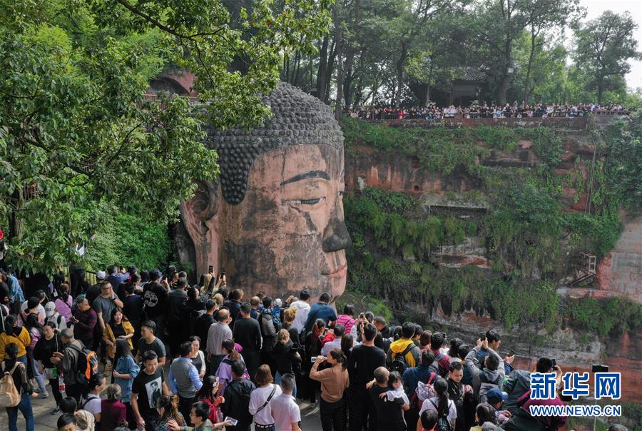 10月4日,游客在樂山大佛景區(qū)的棧道上有序排隊,一睹大佛真容?!⌒氯A社記者 江宏景 攝