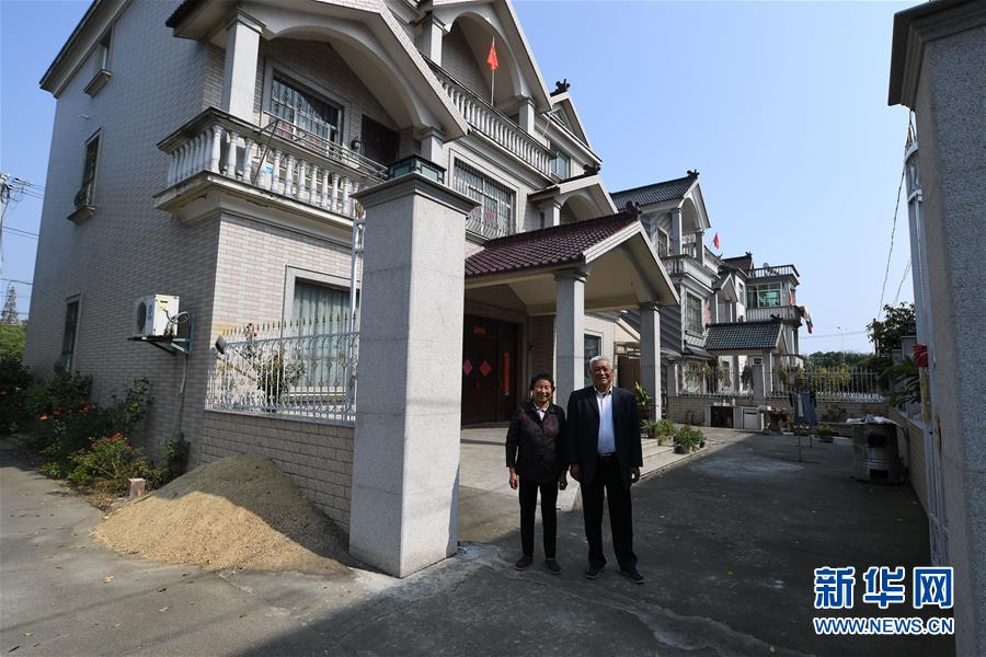 現(xiàn)年72歲的姚苗英(左)與丈夫在自家新修建的樓房前留影(10月23日攝)。姚苗英家的老房因修建公路拆遷,新房是在村里統(tǒng)一規(guī)劃下新址新建。 新華社記者 季春鵬攝