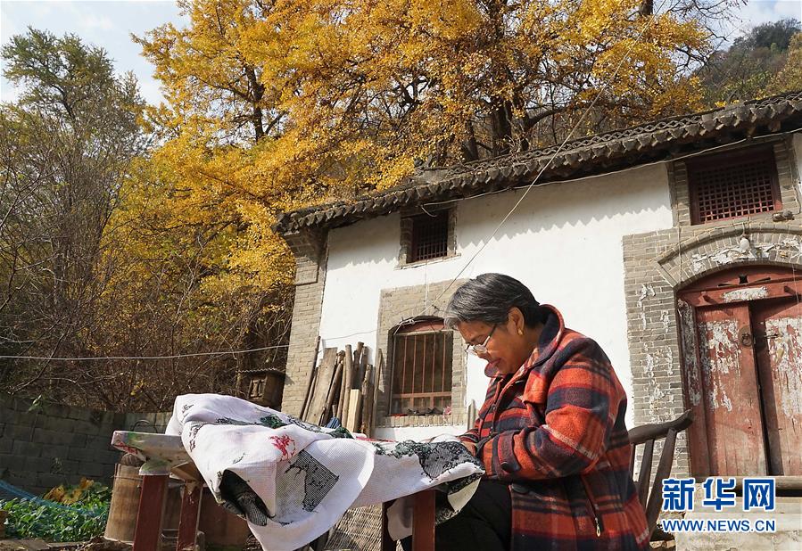 11月1日,河南省嵩縣白河鄉(xiāng)下寺村的一位村民在自家門前制作刺繡工藝品。 深秋時節(jié),河南省嵩縣白河鄉(xiāng)下寺村的古銀杏林為小山村披上了“金甲”。漫天黃葉,遍地金色,一幢幢民居掩映在色彩斑斕的世界里,美不勝收,吸引了眾多游客賞景拍照。 新華社記者 李安 攝