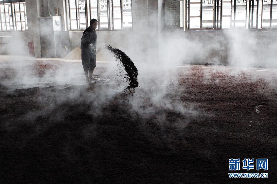 貴州省仁懷市茅臺(tái)鎮(zhèn)茅臺(tái)酒廠的釀酒工人把蒸好的糯高粱進(jìn)行攤涼(10月23日攝)。 新華社記者 林立平 攝