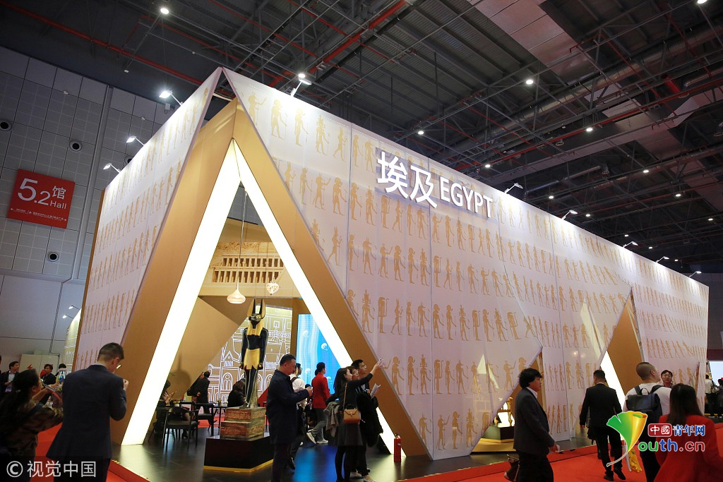 2018年11月6日,上海,首屆中國國際進(jìn)口博覽會國家展上,共有82個(gè)國家、3個(gè)國際組織設(shè)立了71個(gè)展臺。埃及館。視覺中國