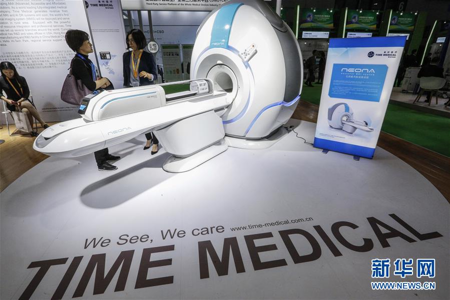 11月6日,美時(shí)醫(yī)療(美國)有限公司工作人員為參觀者介紹世界首臺嬰幼兒專用核磁共振儀。該設(shè)備填補(bǔ)了這個(gè)領(lǐng)域的市場空白,體型輕巧,成像分辨率高,更方便在新生兒重癥監(jiān)護(hù)室里使用。