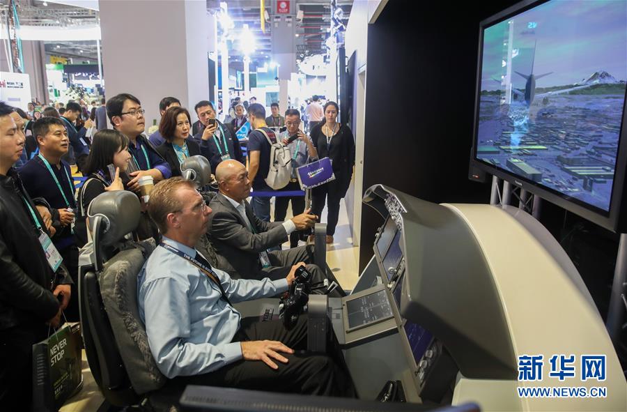 11月6日,參觀者在美國波音公司展臺體驗(yàn)“駕駛”波音客機(jī)。新華社記者 丁汀 攝