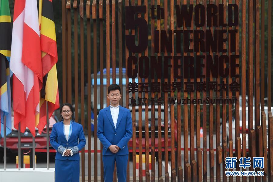 11月6日,來自浙江外國語學(xué)院的大學(xué)生志愿者在烏鎮(zhèn)迎接參會嘉賓。 新華社記者黃宗治攝