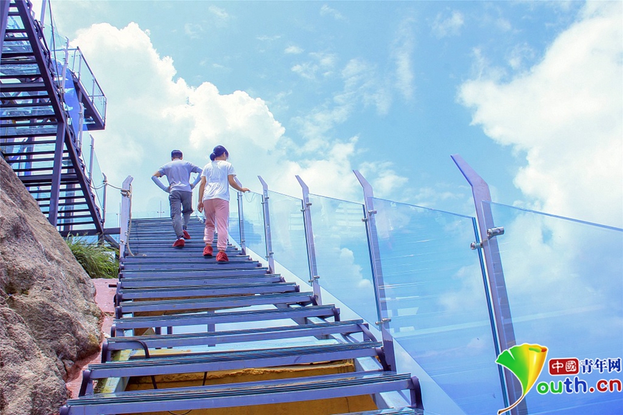 2018年8月,廣東清遠(yuǎn)。如今,玻璃橋、玻璃觀景臺(tái)、玻璃漂流道、玻璃滑道等玻璃產(chǎn)品可以說(shuō)多如牛毛,琳瑯滿目。這些玻璃產(chǎn)品都是水平的,即使有坡度,也是借助工具滑下去的。小伙伴們是否挑戰(zhàn)體驗(yàn)過(guò)像樓梯一樣的玻璃天梯,階梯式攀向高處,直聳云宵,云霧飄渺。