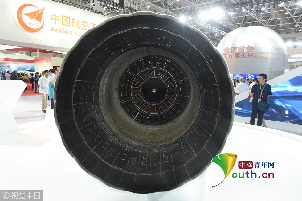 2018年11月7日,珠海航展上,觀眾在觀看國(guó)產(chǎn)新型渦扇發(fā)動(dòng)機(jī)“太行發(fā)動(dòng)機(jī)”。圖片作者:龍巍/視覺中國(guó)