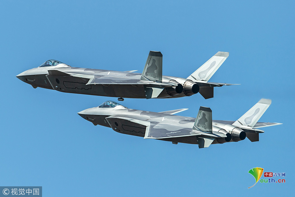 圖七:2018年11月6日,廣東珠海航展上,兩架殲-20戰(zhàn)機(jī)組成雙機(jī)編隊(duì)進(jìn)行飛行表演。