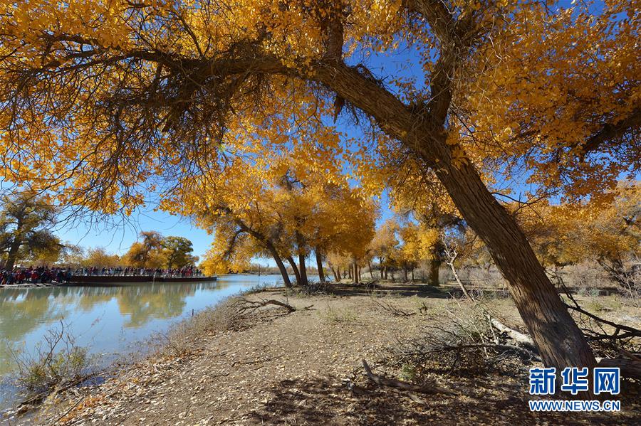 大片的胡楊樹葉由綠變黃,一眼望去,陽(yáng)光下金色的樹葉襯著湛藍(lán)的天空于風(fēng)中婆娑起舞。