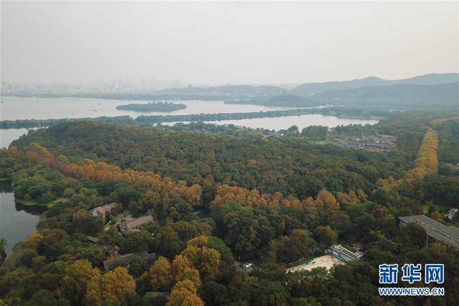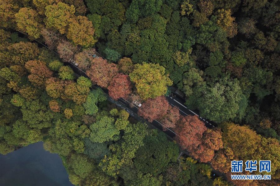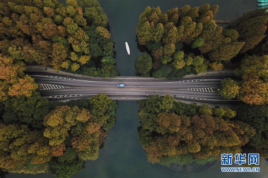 11月13日無(wú)人機(jī)拍攝的杭州西湖一景。 時(shí)值初冬,杭州市西湖景區(qū)層林盡染,色彩斑斕,別有一番韻味。