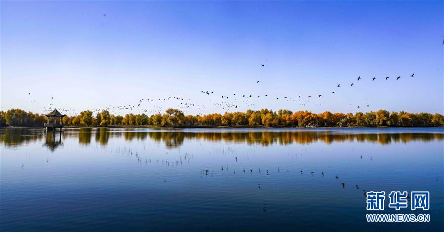 在位于新疆巴音郭楞蒙古自治州輪臺(tái)縣的一處胡楊林里,一群鳥從水面上飛過(guò)(10月25日攝)。 新華社記者 趙戈 攝