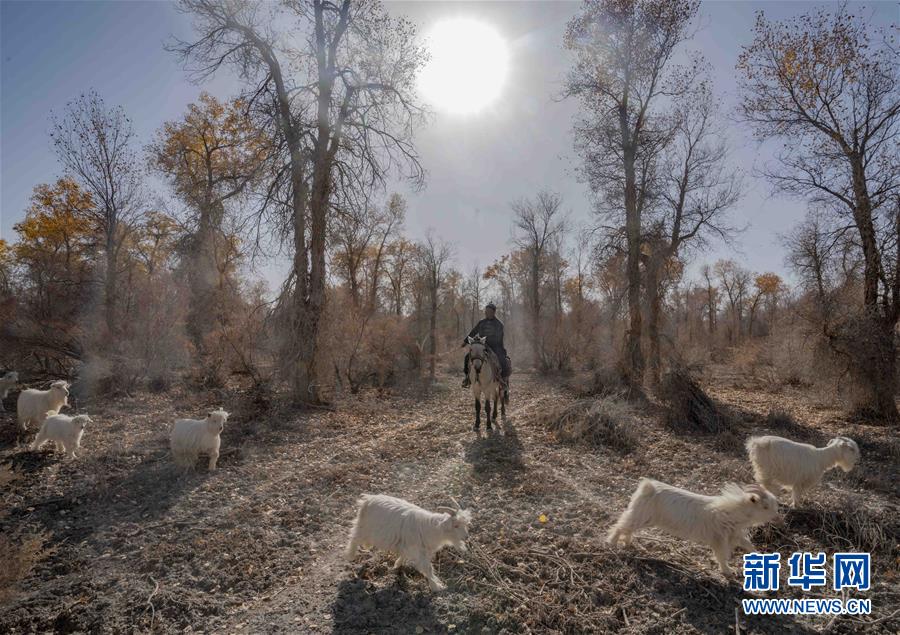 在新疆巴音郭楞蒙古自治州尉犁縣喀爾曲尕鄉(xiāng)的胡楊林里,牧羊人馬木提·買買提在放羊(10月25日攝)。 新華社記者 趙戈 攝