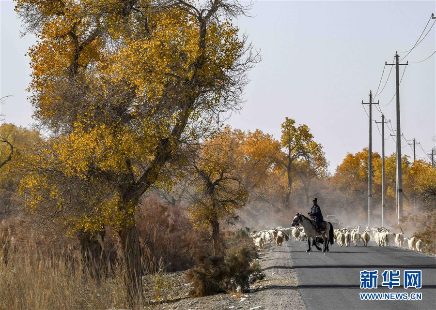 在新疆尉犁縣喀爾曲尕鄉(xiāng),牧羊人馬木提·買買提在胡楊邊上的道路上牧羊(10月25日攝)。 10月中下旬,靜靜的塔里木河中下游一片金黃。胡楊深處,條條小路蜿蜒綿長(zhǎng)通向遠(yuǎn)方,引人入勝。 塔里木河是中國(guó)最長(zhǎng)的內(nèi)陸河,這一區(qū)域原始胡楊林分布較為集中。隨著塔里木河連續(xù)19次向下游生態(tài)輸水,為胡楊林“解渴”,塔河兩岸生態(tài)得到明顯改善,沙地面積逐年減少。 新華社記者趙戈攝