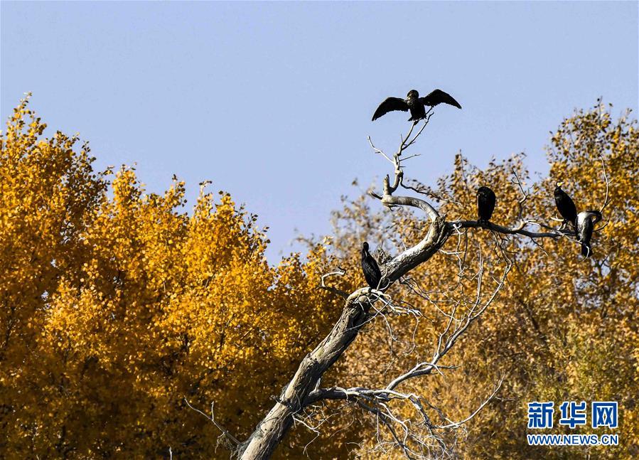 在位于新疆巴音郭楞蒙古自治州輪臺(tái)縣的一處胡楊林里,鳥兒站在胡楊枝頭上(10月25日攝)。