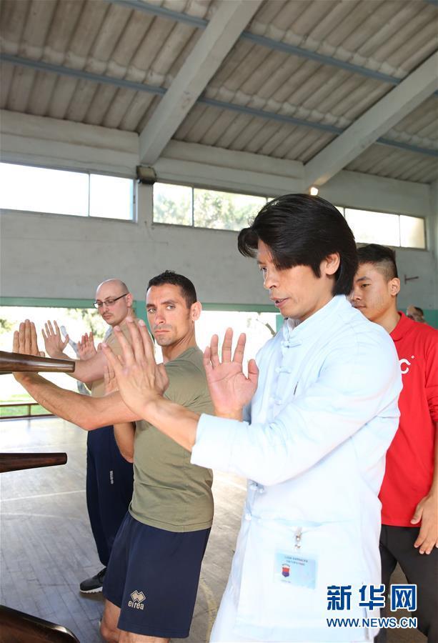 11月13日,在馬耳他首都瓦萊塔,鄭祖杰(前右)向馬耳他士兵展示詠春拳。 當(dāng)日,中國國家級非物質(zhì)文化遺產(chǎn)詠春拳代表性傳承人鄭祖杰走進(jìn)馬耳他武裝部隊(duì),向官兵展示詠春拳。這一活動是馬耳他中國文化中心與馬耳他武術(shù)協(xié)會合辦的詠春拳系列展示活動之一。 新華社記者 袁韻 攝