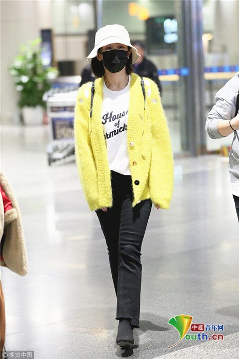 日前,楊紫現身長沙黃花機場,她頭戴漁夫帽的她口罩遮面,身著鮮黃針織衫相當搶眼,一路獲粉絲跟拍。