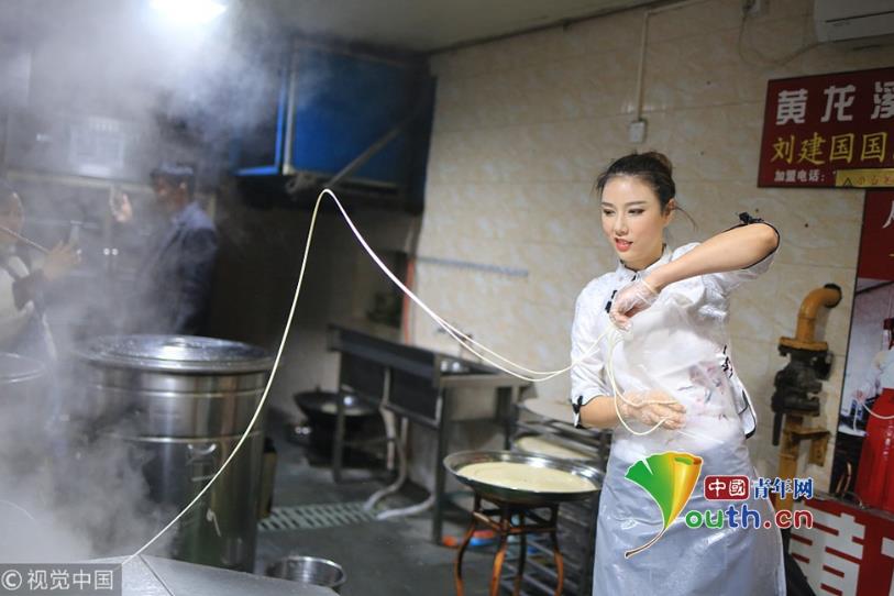 2018年11月19日,成都,繼“妖嬈拉面哥”之后,黃龍溪古鎮(zhèn)一個身材高挑的古裝美女,一邊跳舞一邊揮甩著手中的面條被贊“甩面仙子”走紅網(wǎng)絡(luò)。圖片作者:紅葉/視覺中國