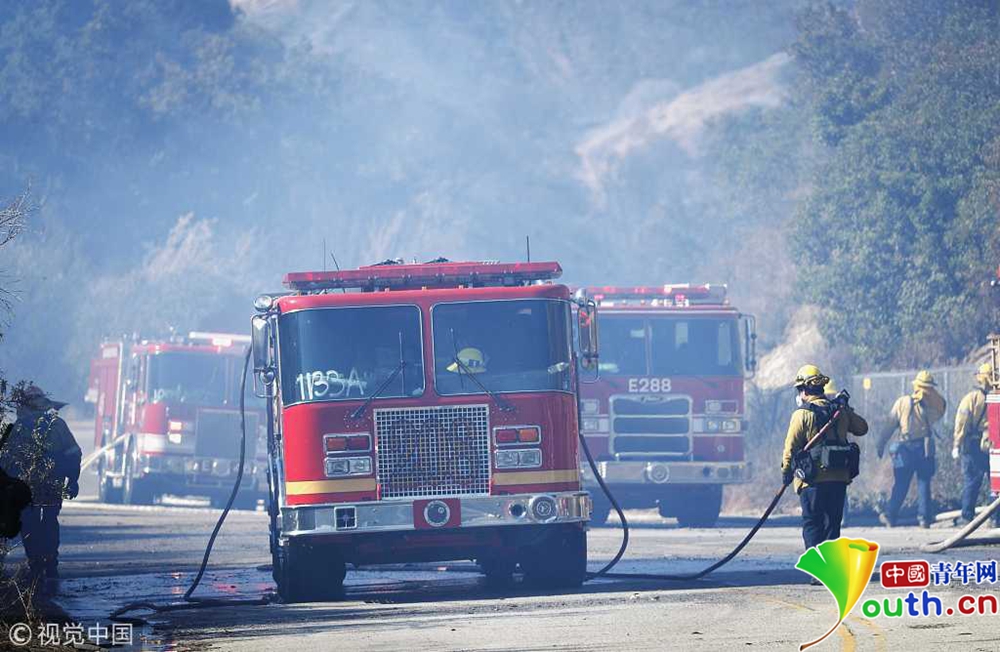 該郡第二大城市千橡樹市(Thousand Oaks)等很多地方房屋被毀,高速公路封閉,居民緊急疏散。洛杉磯郡圣蓋博市(San Gabriel)警察局警官日瓦戈(O. Zhivaga)和同事們當(dāng)天清晨即受命馳援文圖拉郡,保護(hù)當(dāng)?shù)鼐用窈拓敭a(chǎn)安全。圖為消防車行駛在已封閉的公路上,天空中濃煙滾滾。