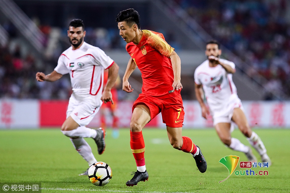 2018年11月20日,??冢?018國際足球友誼賽,中國男足Vs巴勒斯坦。郜林拼搶 圖片作者:null