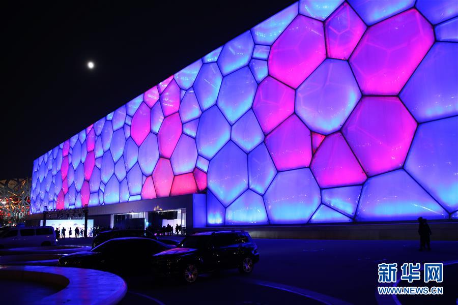 11月20日,在北京舉行的世界兒童日主題活動上,國家游泳中心外墻被點亮。 新華社記者張玉薇攝