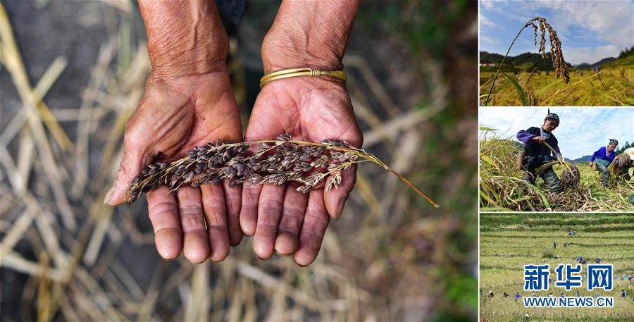拼版照片:左圖為在安太鄉(xiāng)元寶村,80歲的賈榮專手捧剛剛收獲的香糯;右上圖為成熟待收的香糯;右中圖為賈榮專(左)在收割香糯;右下圖為村民們在收香糯(照片均攝于10月30日)。2017年,賈榮專加入村里的香糯種植合作社。香糯是廣西融水大苗山的特產(chǎn),它生長在高寒高海拔的特殊自然環(huán)境中,產(chǎn)量少,營養(yǎng)價值高。 廣西融水苗族自治縣是國家扶貧工作重點縣,全縣“九山半水半分田”,生活生產(chǎn)環(huán)境較為惡劣,脫貧攻堅任務艱巨,目前還有7.68萬貧困人口。面對經(jīng)濟發(fā)展落后、貧困面廣且程度深的現(xiàn)狀,當?shù)匕衙撠毠耘c創(chuàng)新產(chǎn)業(yè)扶持相結合,依托生態(tài)資源優(yōu)勢,實施“特色產(chǎn)業(yè)富民行動”,通過發(fā)展特色民族旅游、林下經(jīng)濟和特色養(yǎng)殖業(yè)等扶貧產(chǎn)業(yè),帶動貧困群眾依靠勤勞的雙手,拔窮根摘窮帽,實現(xiàn)脫貧致富。據(jù)了解,目前全縣貧困戶參與特色產(chǎn)業(yè)發(fā)展的有2.9萬戶,扶貧產(chǎn)業(yè)覆蓋率達95%。 新華社記者 黃孝邦 攝