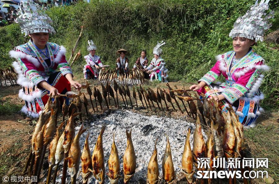 深圳新聞網(wǎng)訊 2018年9月15日,廣西柳州市融水苗族自治縣喜迎中國首屆“農(nóng)民豐收節(jié)”——2018金秋燒魚季啟動儀式在桿洞鄉(xiāng)花孖苗寨舉行,數(shù)百名苗族群眾和游人共同開展了水田拔河、田間捉魚、傳統(tǒng)打谷和燒魚等活動,慶祝豐收。