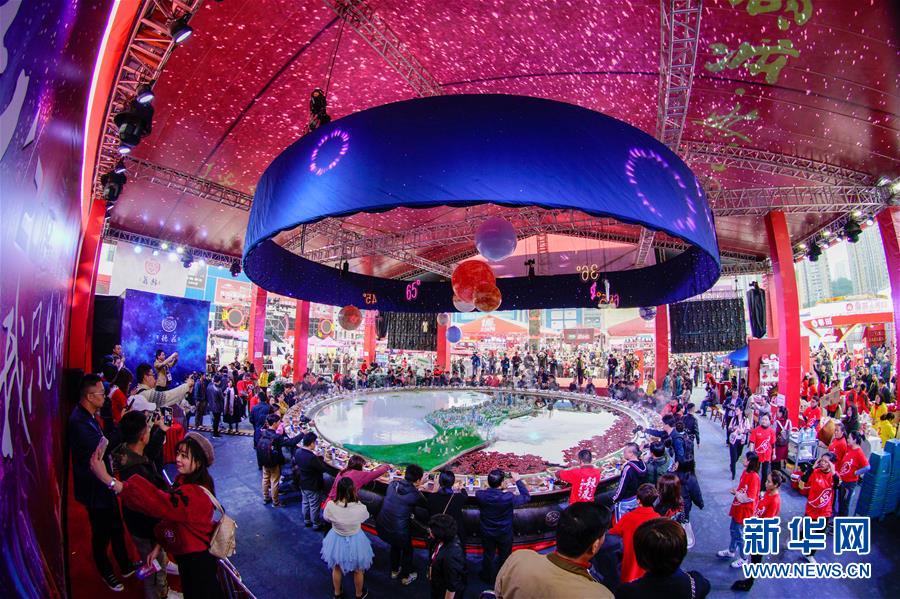 10月19日在重慶拍攝的火鍋美食文化節(jié)現(xiàn)場。 當日,第十屆中國(重慶)火鍋美食文化節(jié)在重慶市江北區(qū)正式開幕。本屆火鍋美食文化節(jié)為期4天,以“麻辣happy城市節(jié)日”為主題,50000平方米的展區(qū)吸引了70余個火鍋品牌、300余家火鍋供應鏈企業(yè)參展,萬人同燙火鍋的盛況在“火鍋之都”重慶再現(xiàn)。 新華社記者 劉潺 攝