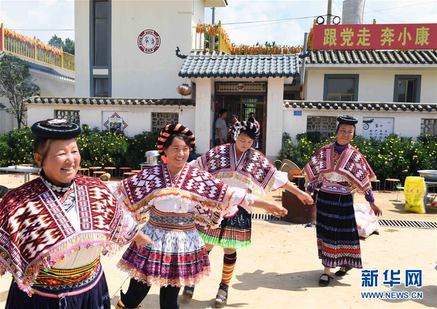 10月6日,在尋甸回族彝族自治縣塘子街道小海村,人們在村里的活動廣場表演民間歌舞。國慶節(jié)期間,云南省尋甸回族彝族自治縣塘子街道小海村一片喜慶祥和。人們身著節(jié)日盛裝,載歌載舞,歡慶搬入新居后的第一個國慶節(jié)。新華社記者楊宗友攝
