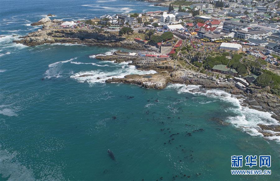 9月30日,在南非赫曼紐斯小鎮(zhèn)附近海面上,南露脊鯨在海岸邊暢游。9月29日,位于開普敦以東約115公里的赫曼紐斯小鎮(zhèn)迎來2018年的鯨魚節(jié),來自世界各地的游客可乘船出海觀鯨,也可在岸邊等待鯨魚的到來。新華社記者陳誠攝
