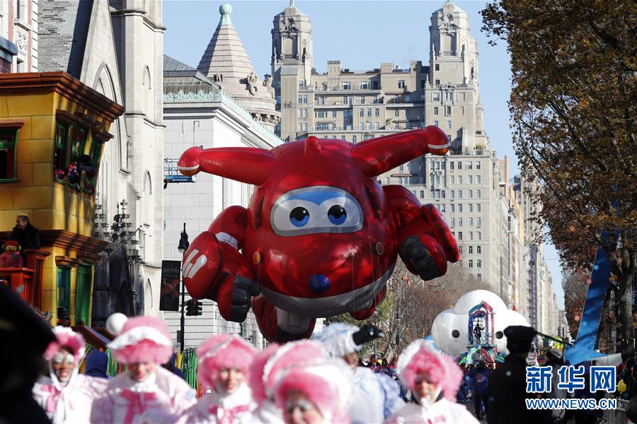 11月22日,在美國紐約感恩節(jié)大游行上,“超級飛俠樂迪”造型氣球行進在曼哈頓街頭。