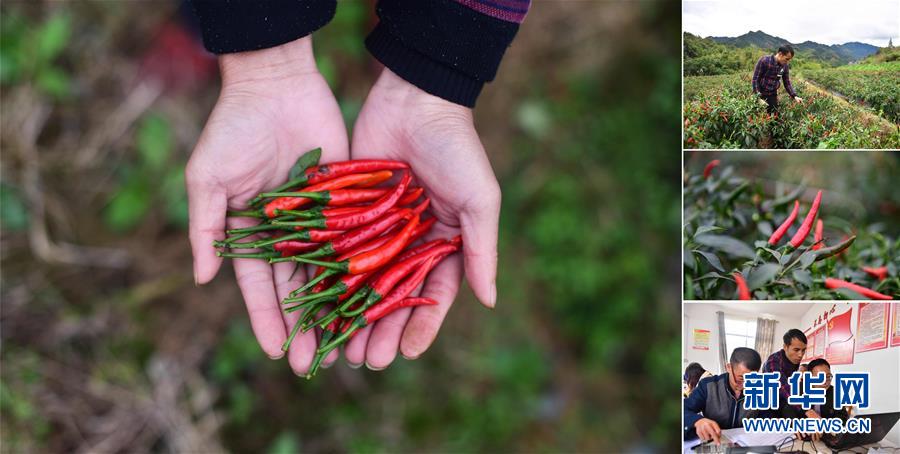 拼版照片:左圖為在大浪鎮(zhèn)大德村,龍德手捧剛剛收獲的辣椒;右上圖為龍德在摘辣椒;右中圖為合作社種植的辣椒;右下圖為龍德(中)在辦公室里工作(照片均攝于11月18日)。龍德是大德村的致富帶頭人,目前合作社種植有400多畝辣椒,帶動106戶貧困戶參與。 廣西融水苗族自治縣是國家扶貧工作重點(diǎn)縣,全縣“九山半水半分田”,生活生產(chǎn)環(huán)境較為惡劣,脫貧攻堅任務(wù)艱巨,目前還有7.68萬貧困人口。面對經(jīng)濟(jì)發(fā)展落后、貧困面廣且程度深的現(xiàn)狀,當(dāng)?shù)匕衙撠毠耘c創(chuàng)新產(chǎn)業(yè)扶持相結(jié)合,依托生態(tài)資源優(yōu)勢,實施“特色產(chǎn)業(yè)富民行動”,通過發(fā)展特色民族旅游、林下經(jīng)濟(jì)和特色養(yǎng)殖業(yè)等扶貧產(chǎn)業(yè),帶動貧困群眾依靠勤勞的雙手,拔窮根摘窮帽,實現(xiàn)脫貧致富。據(jù)了解,目前全縣貧困戶參與特色產(chǎn)業(yè)發(fā)展的有2.9萬戶,扶貧產(chǎn)業(yè)覆蓋率達(dá)95%。 新華社記者 黃孝邦 攝