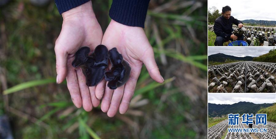 拼版照片:左圖為在大浪鎮(zhèn)上里村,致富帶頭人唐志海手捧剛剛收獲的木耳;右上圖為唐志海在木耳種植基地里采摘木耳;右中圖為木耳種植基地;右下圖為唐志海在木耳種植基地里查看木耳長勢(照片均攝于11月18日)。近年來,上里村依靠發(fā)展紅薯、木耳種植,已于2016年實現(xiàn)脫貧。 廣西融水苗族自治縣是國家扶貧工作重點(diǎn)縣,全縣“九山半水半分田”,生活生產(chǎn)環(huán)境較為惡劣,脫貧攻堅任務(wù)艱巨,目前還有7.68萬貧困人口。面對經(jīng)濟(jì)發(fā)展落后、貧困面廣且程度深的現(xiàn)狀,當(dāng)?shù)匕衙撠毠耘c創(chuàng)新產(chǎn)業(yè)扶持相結(jié)合,依托生態(tài)資源優(yōu)勢,實施“特色產(chǎn)業(yè)富民行動”,通過發(fā)展特色民族旅游、林下經(jīng)濟(jì)和特色養(yǎng)殖業(yè)等扶貧產(chǎn)業(yè),帶動貧困群眾依靠勤勞的雙手,拔窮根摘窮帽,實現(xiàn)脫貧致富。據(jù)了解,目前全縣貧困戶參與特色產(chǎn)業(yè)發(fā)展的有2.9萬戶,扶貧產(chǎn)業(yè)覆蓋率達(dá)95%。 新華社記者 黃孝邦 攝