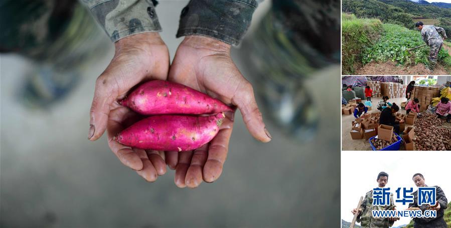 拼版照片:左圖為在大浪鎮(zhèn)桐里村,55歲的韋炳莊手捧剛剛收獲的高山紅薯;右上圖為韋炳莊在地里挖紅薯;右中圖為在縣城一個電商基地里,工作人員打包貧困戶種植的紅薯,準(zhǔn)備發(fā)往全國各地;右下圖為韋炳莊(左)在地里挖紅薯(照片均攝于11月18日)。今年,韋炳莊種植3畝高山紅薯,每畝年產(chǎn)3000多斤,他家已于2016年實現(xiàn)脫貧。 廣西融水苗族自治縣是國家扶貧工作重點(diǎn)縣,全縣“九山半水半分田”,生活生產(chǎn)環(huán)境較為惡劣,脫貧攻堅任務(wù)艱巨,目前還有7.68萬貧困人口。面對經(jīng)濟(jì)發(fā)展落后、貧困面廣且程度深的現(xiàn)狀,當(dāng)?shù)匕衙撠毠耘c創(chuàng)新產(chǎn)業(yè)扶持相結(jié)合,依托生態(tài)資源優(yōu)勢,實施“特色產(chǎn)業(yè)富民行動”,通過發(fā)展特色民族旅游、林下經(jīng)濟(jì)和特色養(yǎng)殖業(yè)等扶貧產(chǎn)業(yè),帶動貧困群眾依靠勤勞的雙手,拔窮根摘窮帽,實現(xiàn)脫貧致富。據(jù)了解,目前全縣貧困戶參與特色產(chǎn)業(yè)發(fā)展的有2.9萬戶,扶貧產(chǎn)業(yè)覆蓋率達(dá)95%。 新華社記者 黃孝邦 攝